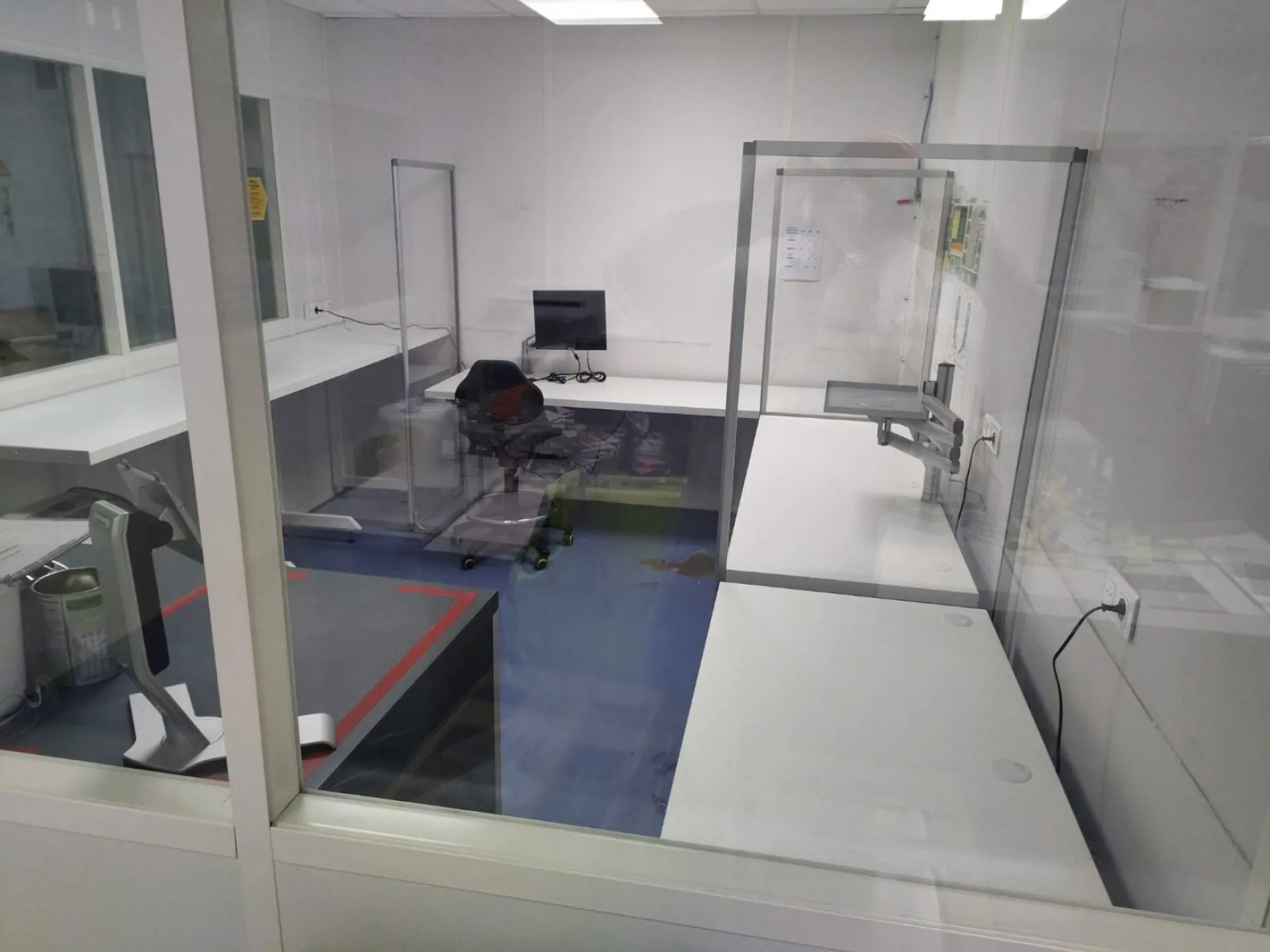 Pour renforcer la protection du personnel et assurer une organisation claire des différents postes de travail, les plans de travail ont été séparéspar des cloisonnettes vitrées sur pieds. Ces séparations transparentes permettent de préserver la visibilité et la communication entre collaborateurs tout en assurant une barrière de sécurité indispensable dans un environnement sensible comme un laboratoire.