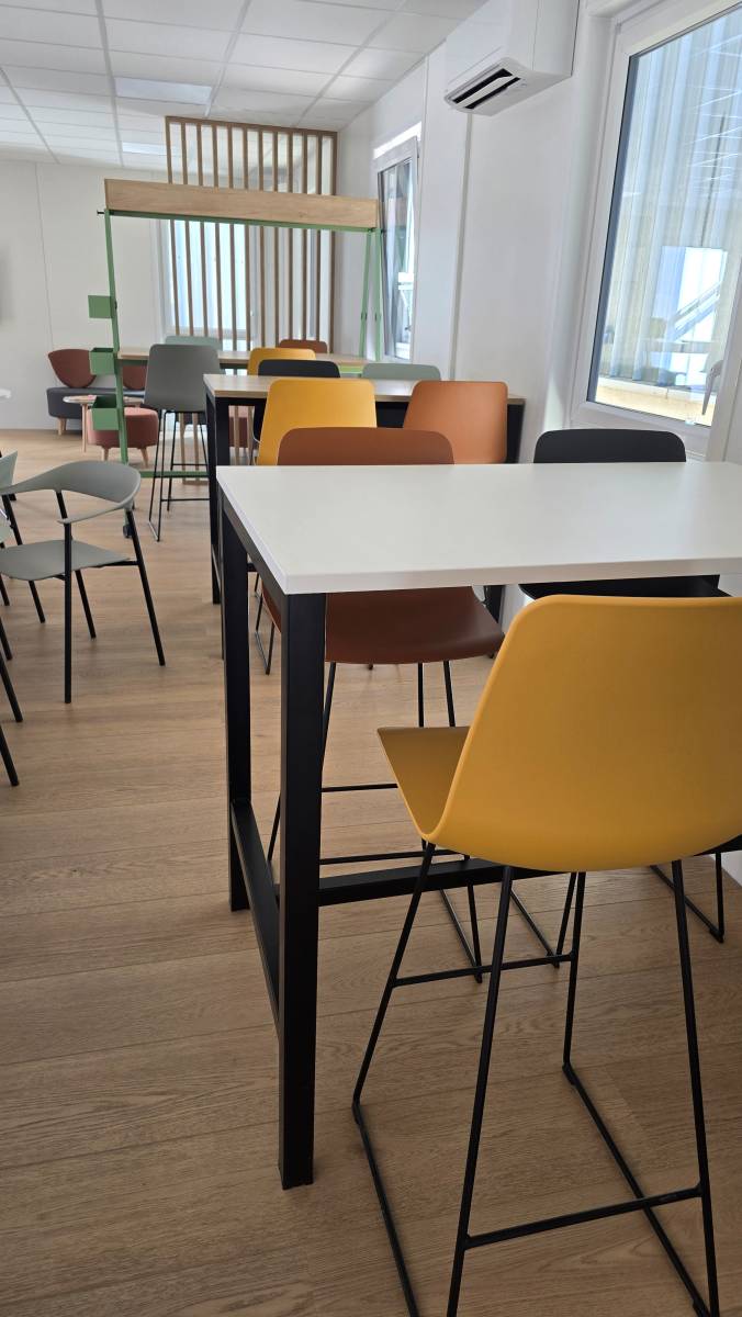 Pour les parties restauration nous avons fait appel aux produits BURONOMIC pour les tables Astrolite Haute, Alto Coworking, Astro et Détente et pour les assises nous avons sélectionné les produits de la marque espagnole INCLASS.