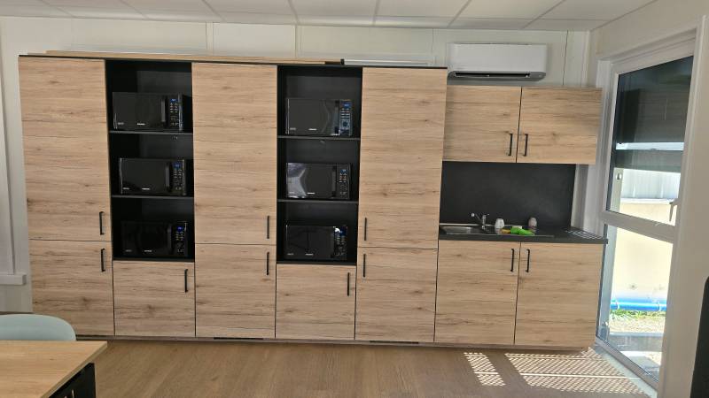 Dans les espaces de restauration, nous avons fourni en collaboration avec notre partenaire SB cuisines, deux ensembles sur mesure équipés d'électroménager.