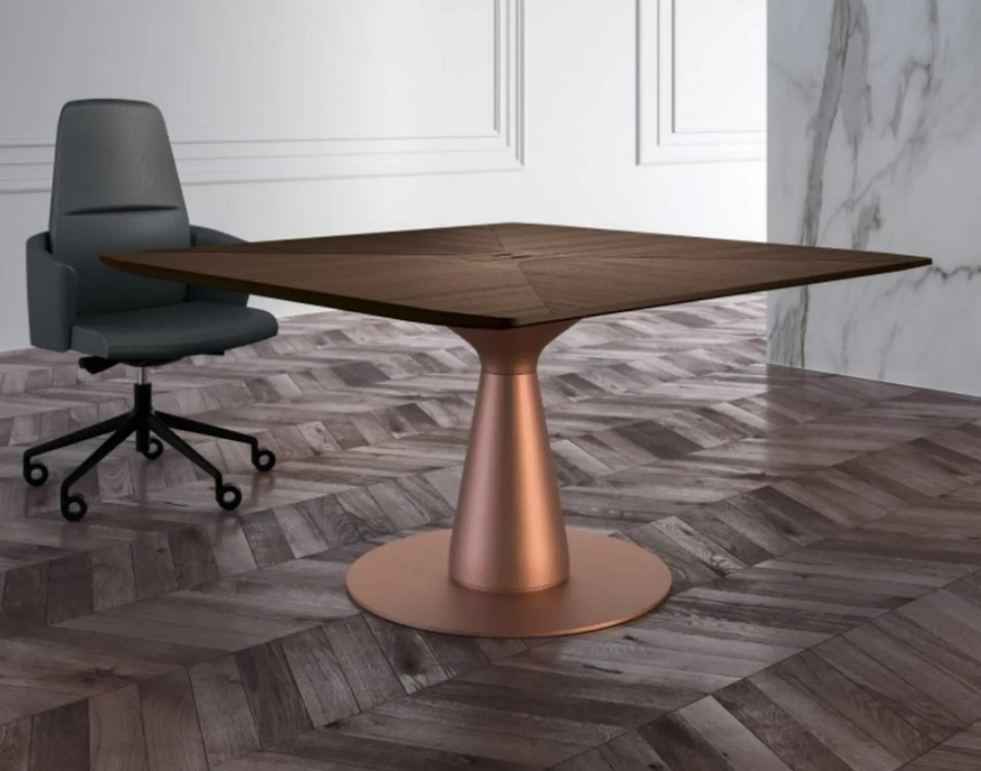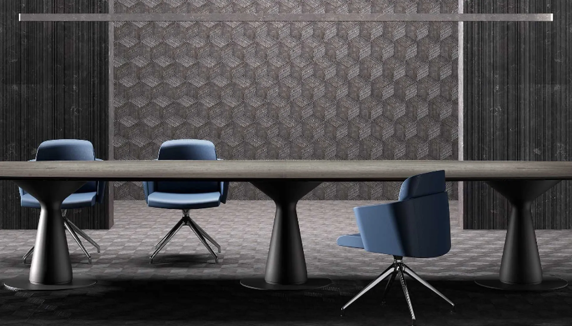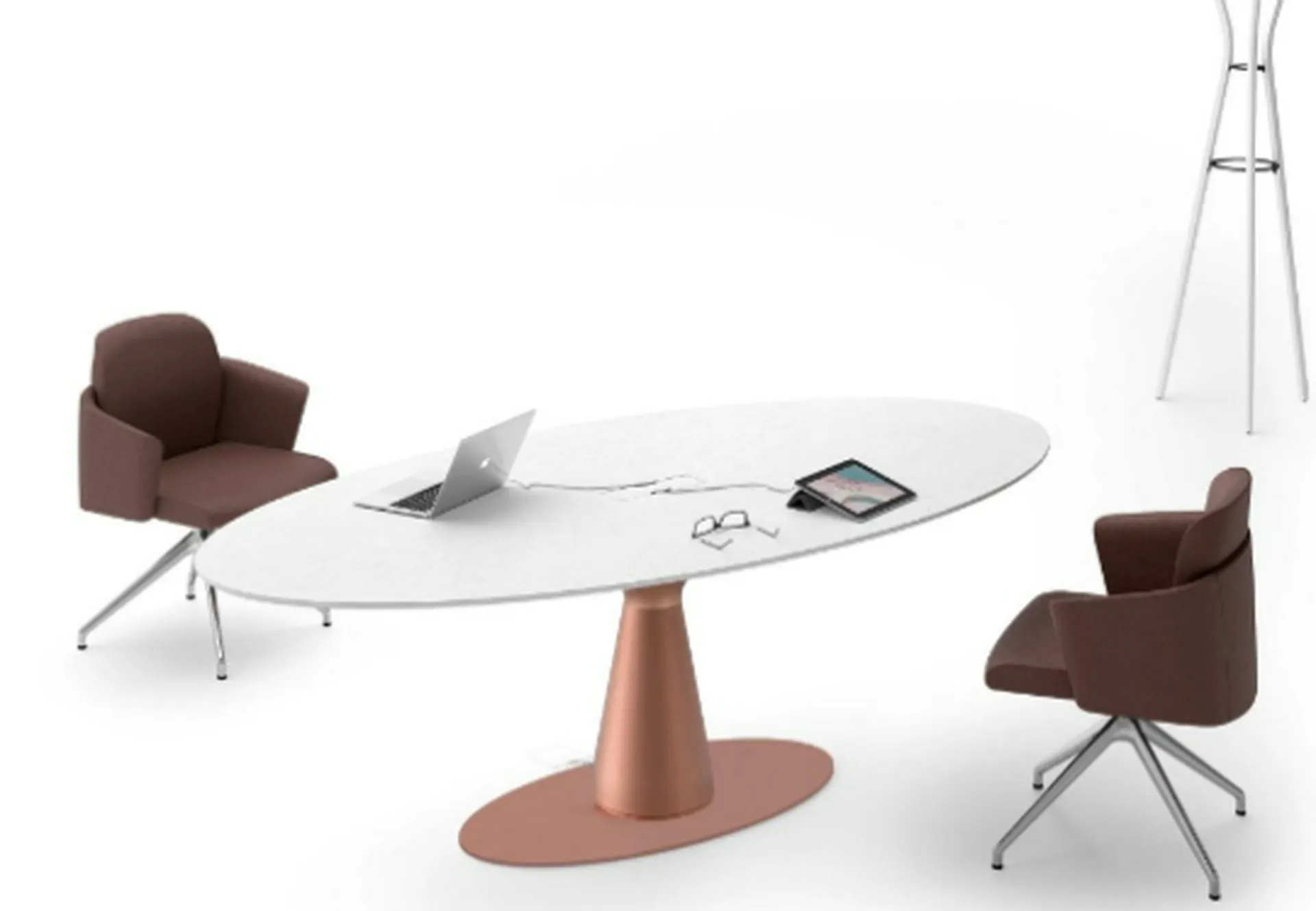 On note que le dessin du pied de la table de réunion donne son identité à la gamme MÉTAR.