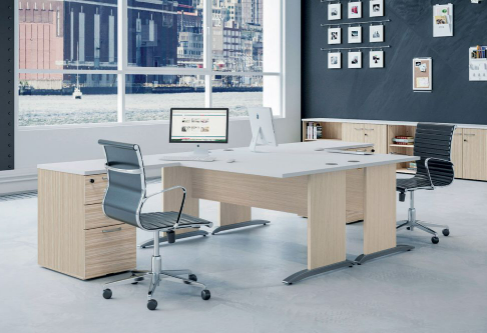 Le pied panneau est constitué d'un panneau bois (panneau structurex) associé à des entretoises métalliques. Ce design confère au bureau une excellente stabilité tout en gardant une ligne épurée. Il donne aussi plus d'intimité lorsqu'on travaille en face à face, puisqu'un voile de fond peut être ajouté. En revanche, le piétement "L" ouvert combine un panneau structurex avec une base en bois massif laqué, créant une ouverture latérale qui rend la structure plus légère visuellement et facilite l'accès sous le plan de travail.
