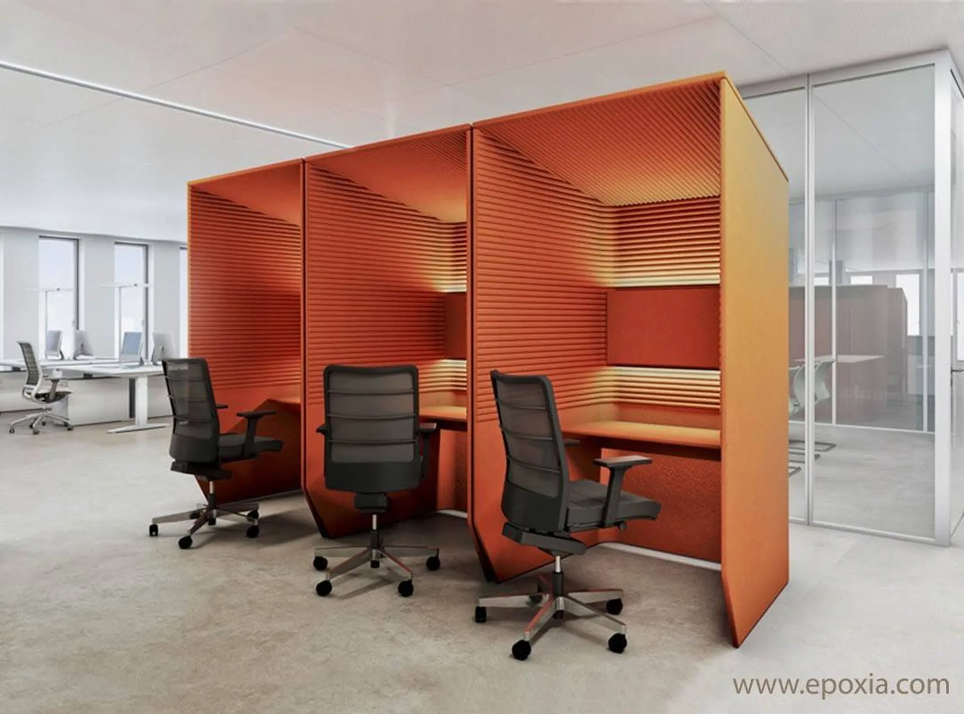Le design est pensé pour être à la fois convivial et performant. Une table intégrée (assise ou debout selon les modèles) avec plateau en bois ou stratifié, parfois équipé d'un passe câble permet à l'utilisateur de travailler ou téléphoner dans un espace intime au sein d'un espace ouvert.