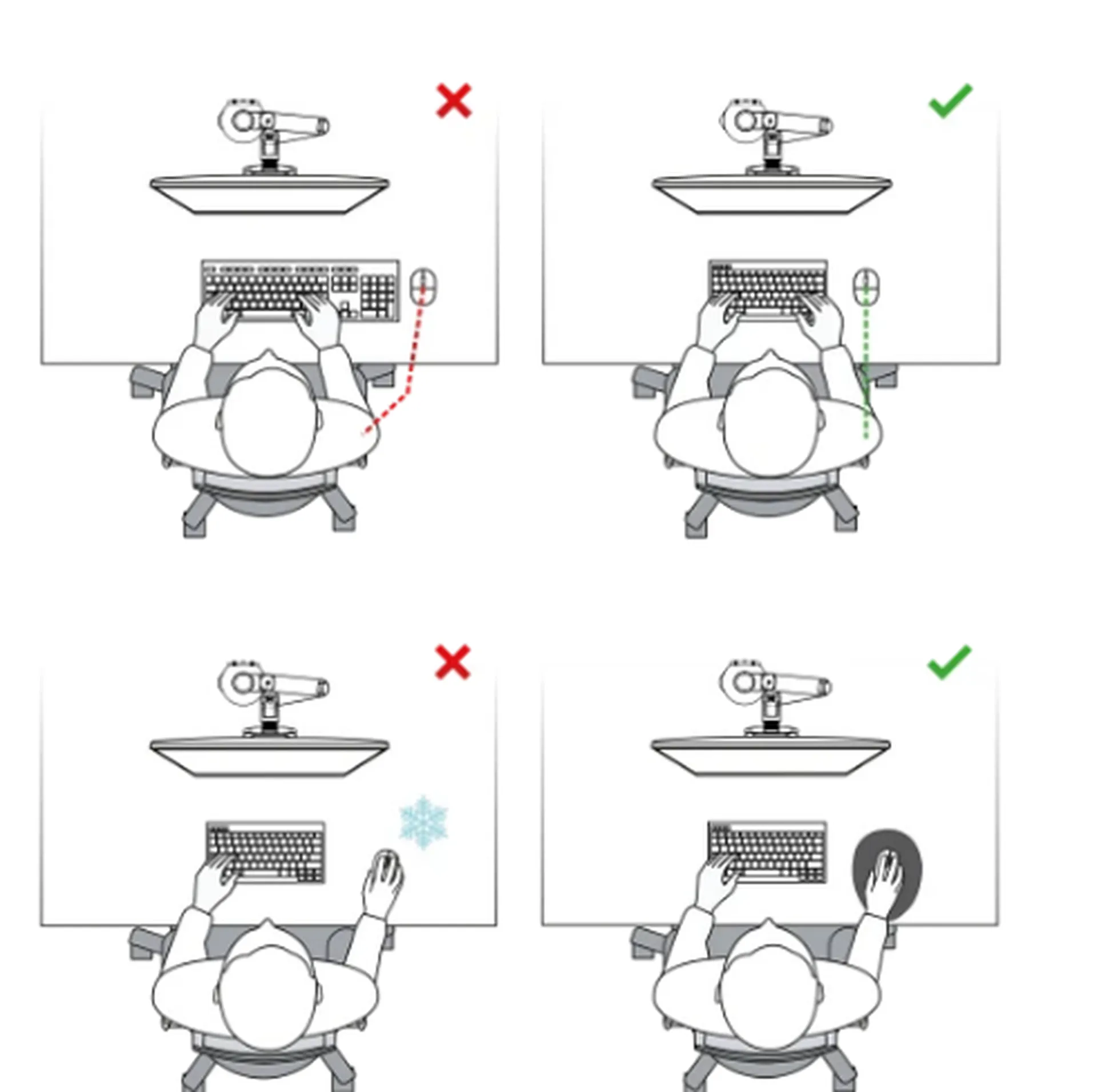 - Repose poignets : Un repose poignets pour le clavier ou la souris peut aider à réduire la tension dans les poignets.